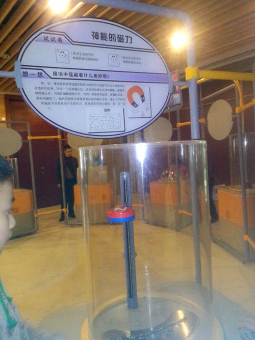 通過趣味性的互動,展示磁力的知識。當參與者調(diào)整磁鐵與鐵鏈之間距離的時候,看到磁鐵與鐵鏈的吸引和分離,感覺到磁場的存在,以及對磁力的大小有一個認知。