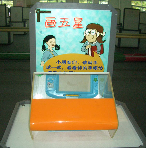 展臺前方有一個(gè)五角星圖形的面板,面板上有一個(gè)橋面模型覆蓋住。觀眾無法直接觀看到五角星圖形。展臺的后方有一個(gè)平面鏡,五角星圖形通過鏡面反射后呈現(xiàn)出虛像。