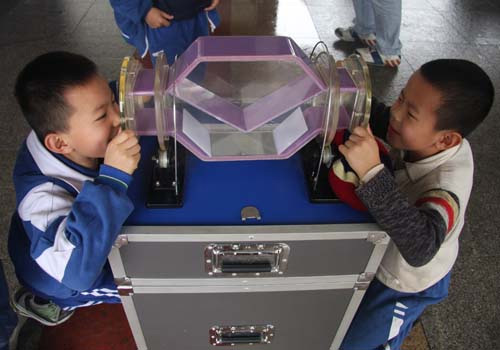 旋轉(zhuǎn)鏡是由三塊平面鏡按一定角度組合而成的。當鏡筒旋轉(zhuǎn)時,三塊鏡子同步轉(zhuǎn)動。盡管觀眾的頭部沒動,但鏡子對物體同一點上入射光的反射位置起了變化,所以觀眾看到對方的影像隨著轉(zhuǎn)角不同而不斷旋轉(zhuǎn)。